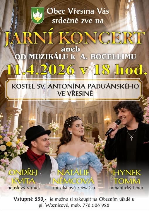 Vstupenky v ceně 250 Kč jsou k zakoupení na Obecním úřadě ve Vřesině u paní Woznicové.