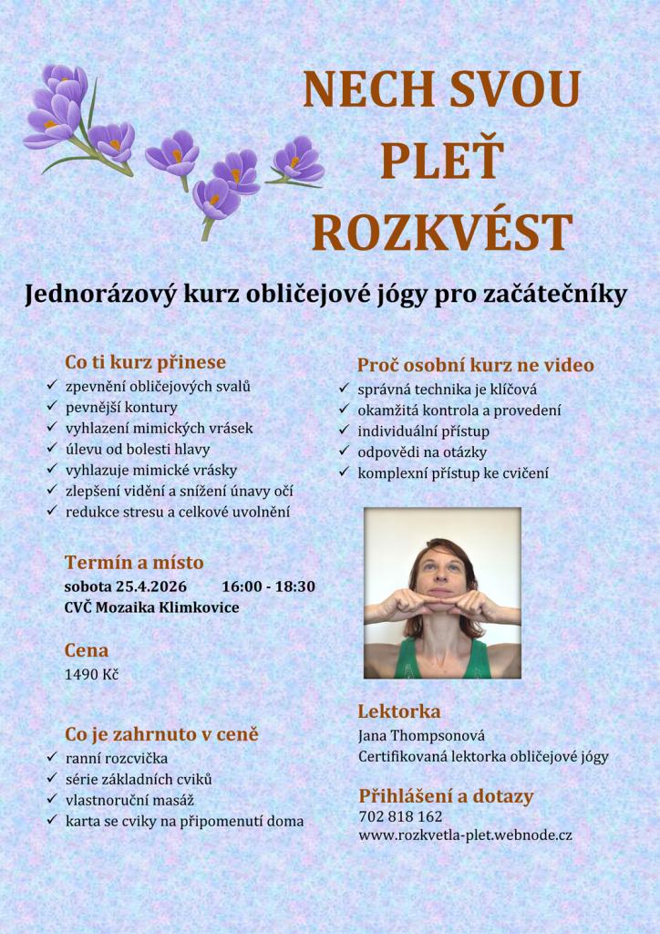 Přijďte si vyzkoušet, jak může obličejová jóga přirozeně podpořit svěžest, pružnost a zdravý vzhled pleti. Kurz je určen pro úplné začátečníky a probíhá formou osobního vedení.