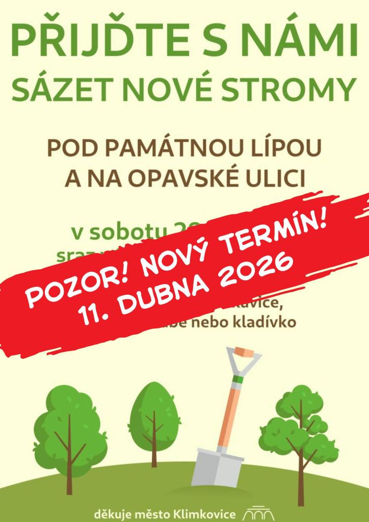 Město Klimkovice pořádá společnou výsadbu pod Památnou lípou a na Opavské ulici. Akce proběhne v sobotu 11. dubna 2026, sraz je v 9:00 u lípy na Lání.