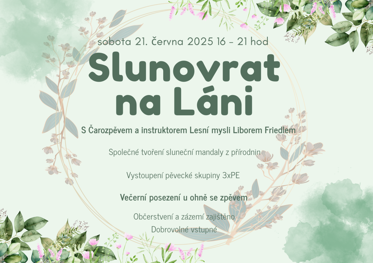 Slunovrat na Láni je odpolední a podvečerní setkání v přírodě s hudbou, tvořením a společným sdílením. Součástí programu je vystoupení skupin Čarozpěv a 3xPE, Lesní mysl s instruktorem Liborem Friedlem, tvoření sluneční mandaly z přírodnin a večerní posezení u ohně. Občerstvení i zázemí je zajištěno