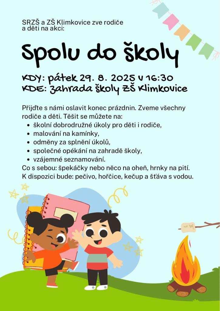 ZŠ Klimkovice zve rodiče a děti na akci "Spolu do školy". Přijďte v pátek 29. srpna 2025 v 16:30 na zahradu školy oslavit konec prázdnin. Čeká na vás školní dobrodružné úkoly, malování na kamínky, odměny za splnění úkolů a společné opékání. Nezapomeňte si přinést špekáčky nebo něco na oheň, hrnky na pití a užijte si vzájemné seznamování.